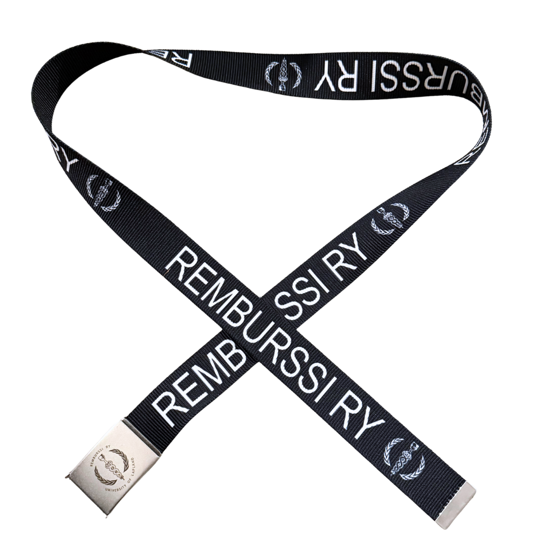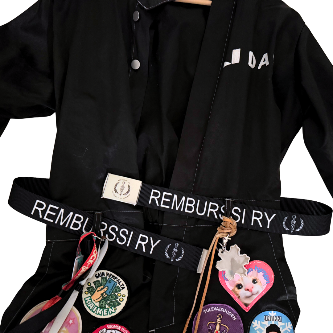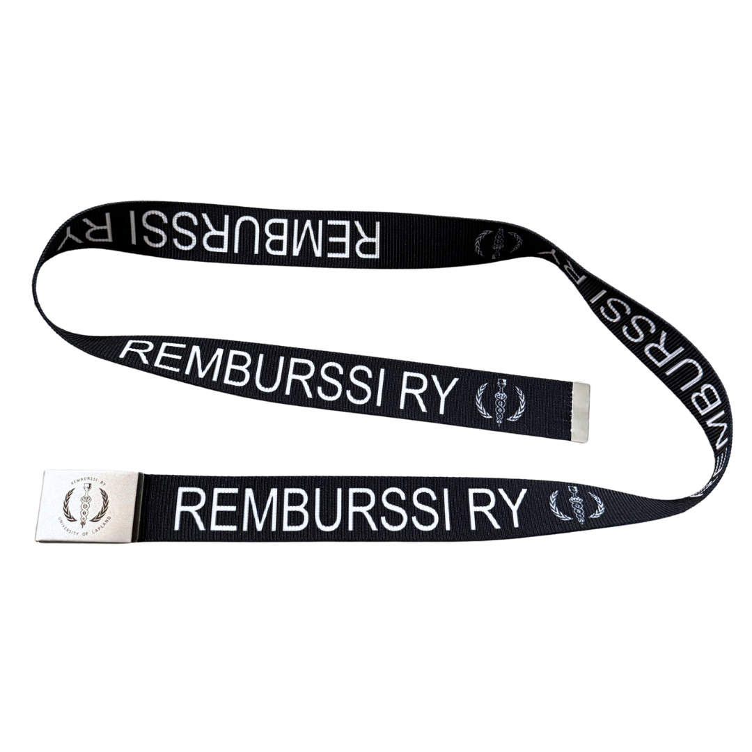 Musta vyö, jossa valkoinen Remburssi-teksti ja logo. Vyössä on metallinen solki, jossa laaseroitu Remburssin logo.
